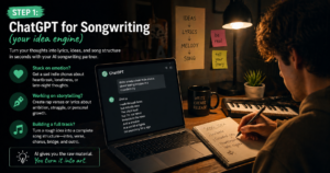 Instead of sitting in front of a blank page waiting for inspiration to magically show up, you use ChatGPT as a creative partner to trigger ideas instantly. Think of it like having a songwriting assistant that never runs out of suggestions, moods, or directions to explore.